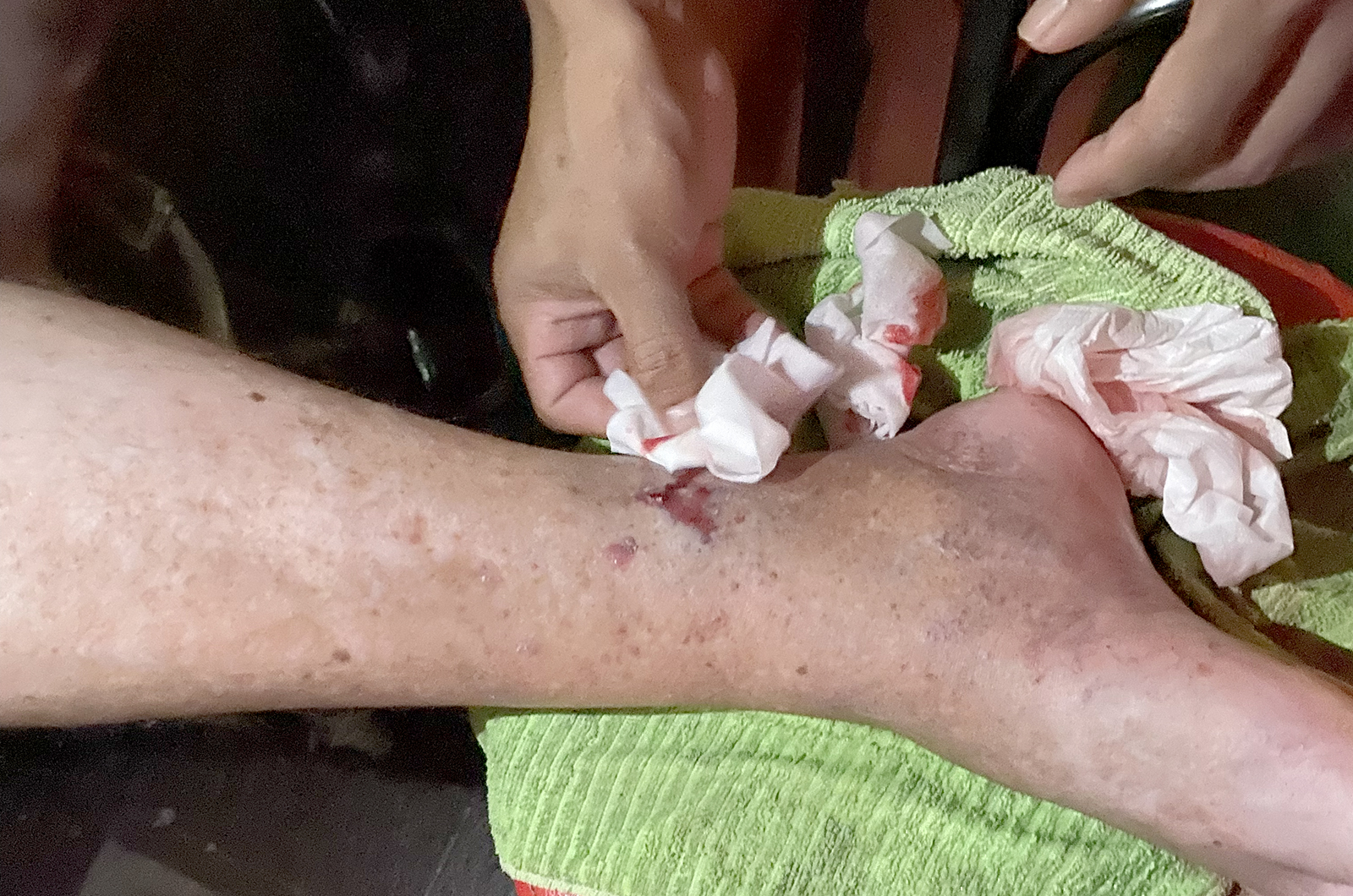 Plus de pétard, plus de fusée, seulement le brouhaha des client médusés regardant leurs blessures. Des brûlures sur le devant pour certains, dans le dos pour d’autres. Un des clients a une plaie ouverte sur sa jambe, sa chérie lui met des compresses en attendant que les ambulanciers prennent la relève. Un coin de la terrasse s’est transformé en infirmenrie de fortune où les personnes, ayant des brûlures, font la queue pour se faire ausculter et soigner.