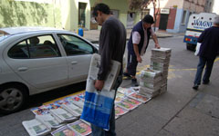 Par contre, ce que l'on voit dans ces rues ce sont tous les petits métiers qui ont disparus chez nous. Il ne viendrait à l'idée de personne à Santiago de cirer ses souliers soi-même; pour 300 pesos (env. frs 0.75) des centaines de cireurs sont prêts à le faire pendant que vous prenez connaissance des nouvelles du jour sur le quotidien mis gracieusement à votre disposition.