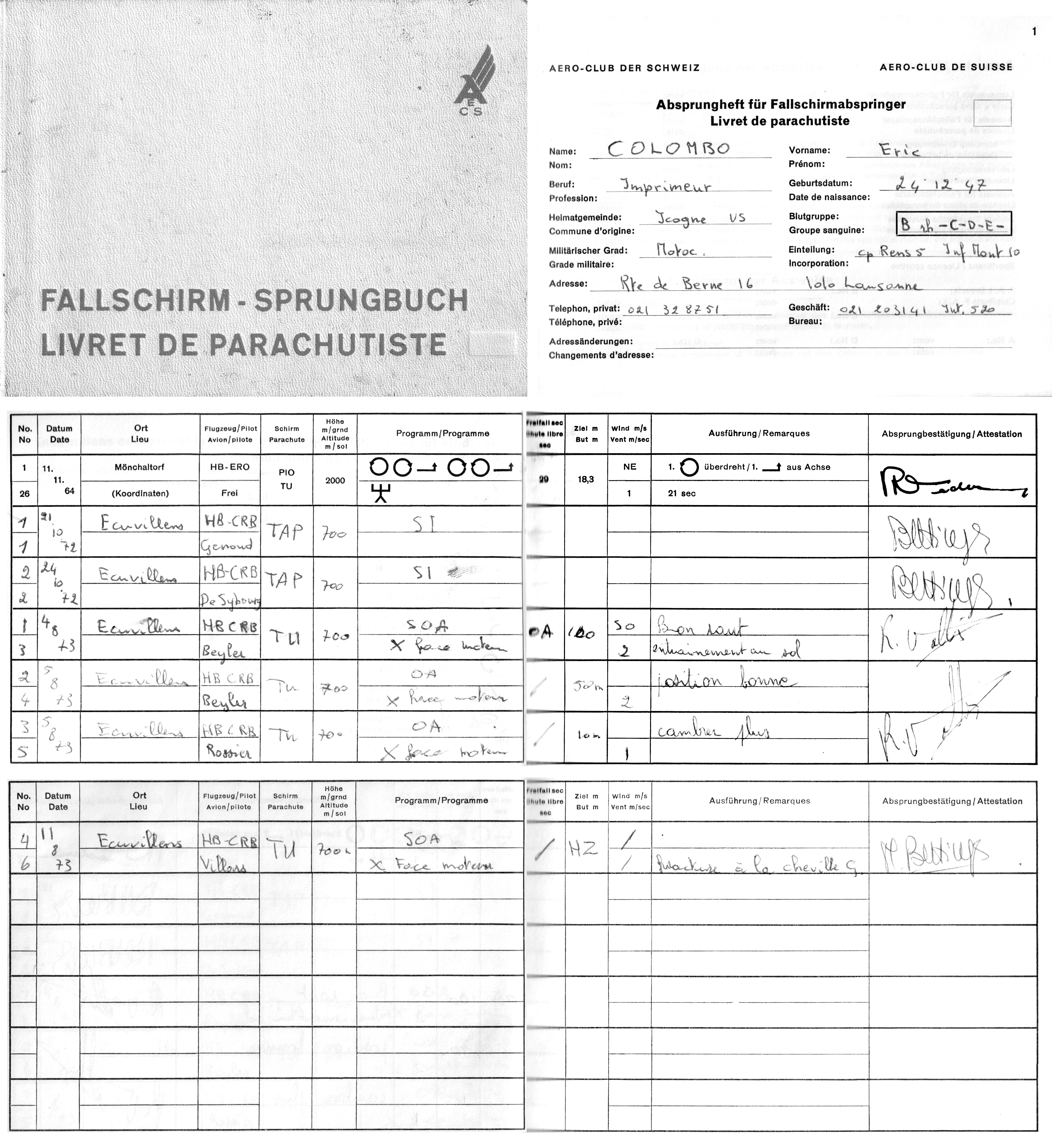 Le samedi 21 octobre 72 nous nous sommes rendu à l'aérodrome d'Ecuvillens et nous avons fait notre saut d'initiation. Notre moniteur nous avait conseillé de croiser les couples. Liliane, ma femme de l'époque, monta dans l'avion avec notre ami Jean-Pierre et Chantal, son épouse, et moi prenions l'avion qui rejoignait la piste après le largage des précédents.