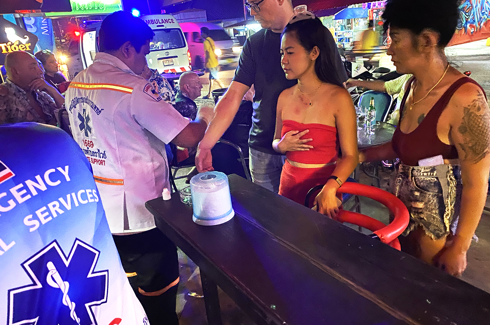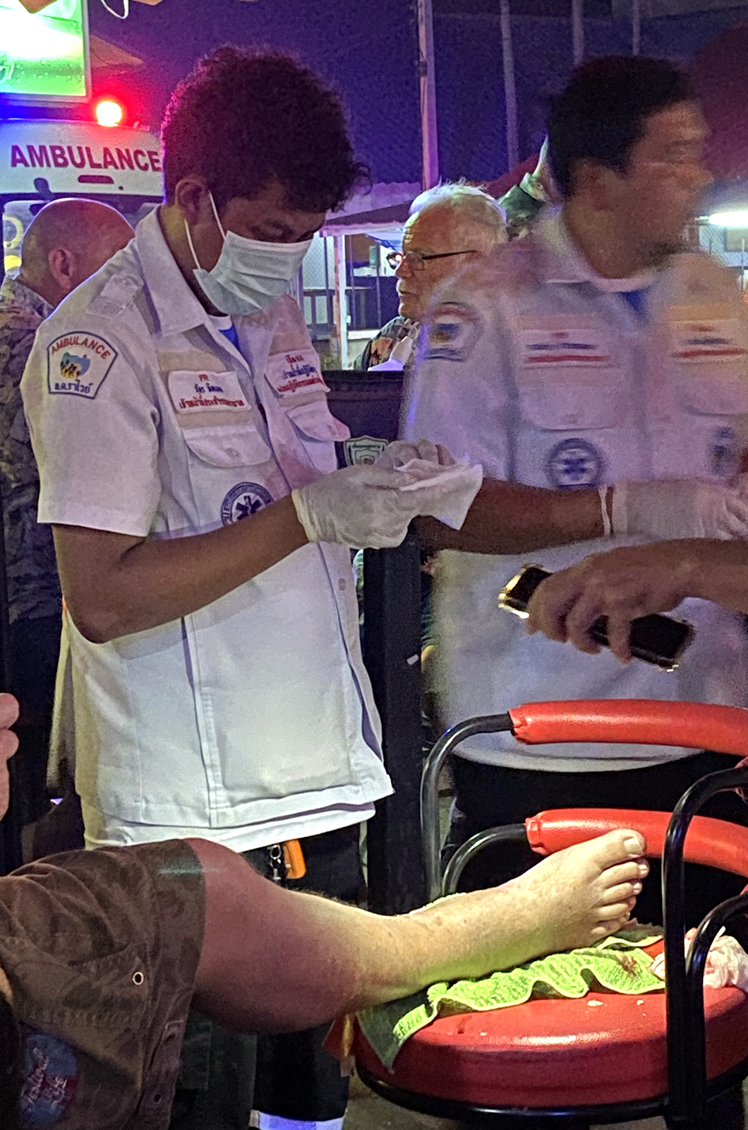 Plus de pétard, plus de fusée, seulement le brouhaha des client médusés regardant leurs blessures. Des brûlures sur le devant pour certains, dans le dos pour d’autres. Un des clients a une plaie ouverte sur sa jambe, sa chérie lui met des compresses en attendant que les ambulanciers prennent la relève. Un coin de la terrasse s’est transformé en infirmenrie de fortune où les personnes, ayant des brûlures, font la queue pour se faire ausculter et soigner.