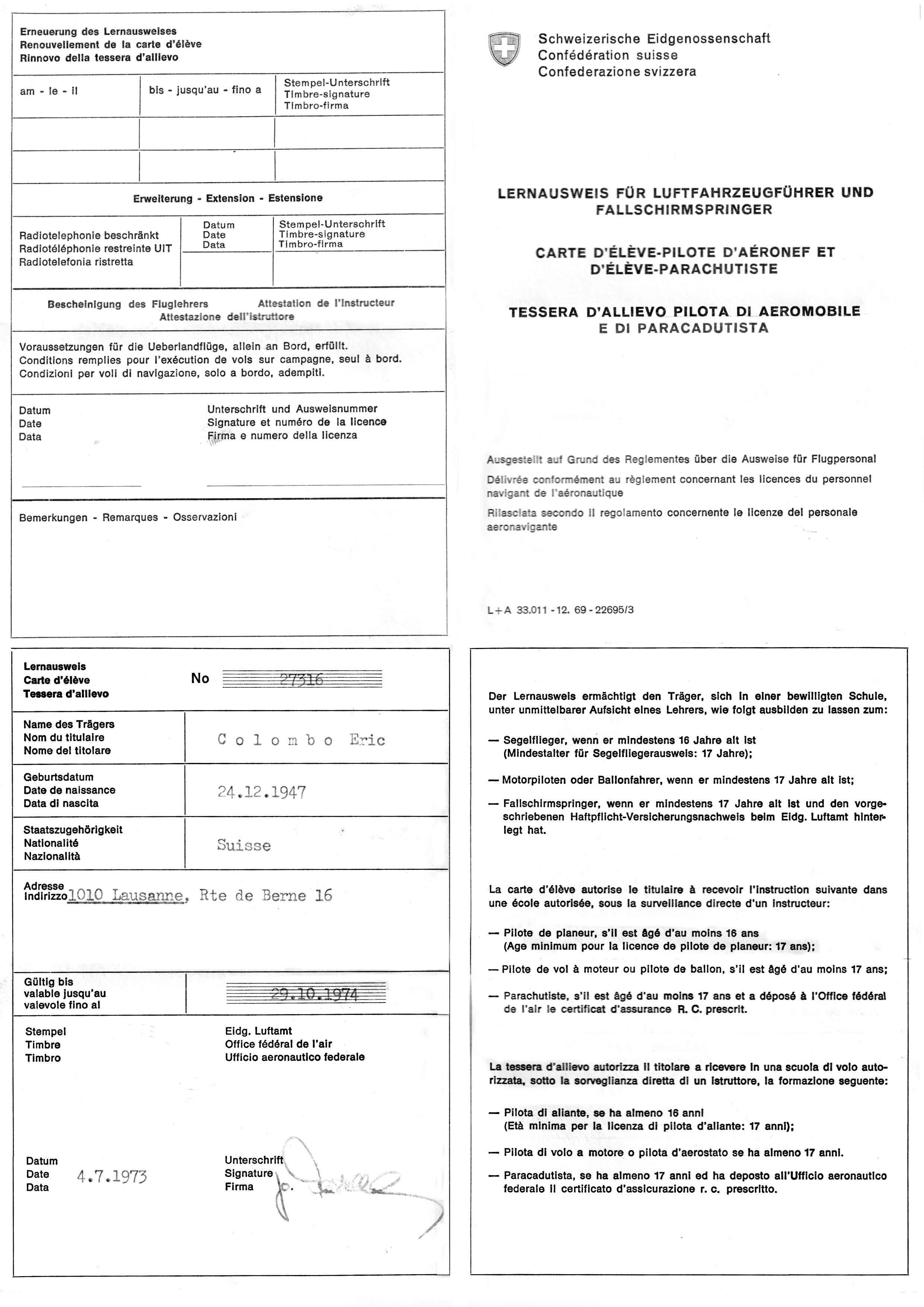 Je laissai l'hiver passer pour, en juillet 73, m'offrir la licence provisoire (voir ci-dessous), 17 sauts payables à l'avance, et cloturé par un examen final.
